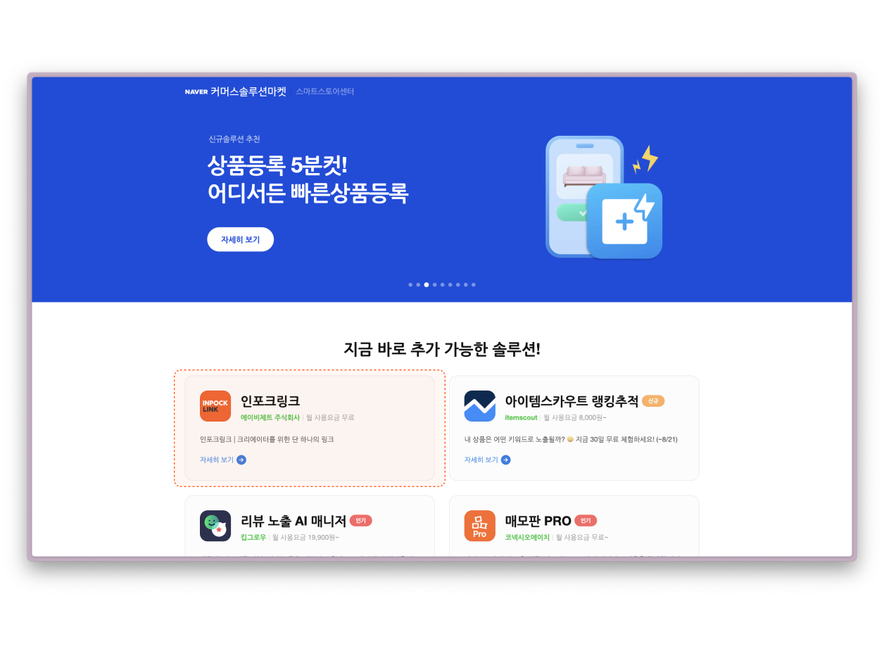 커머스 솔루션 마켓에서 인포크링크를 검색하거나 [링크](https://solution.smartstore.naver.com/ko/solution/SOL_1nthqHycfVX4HfbJMfRznt/detail)를 통해 접속하세요.