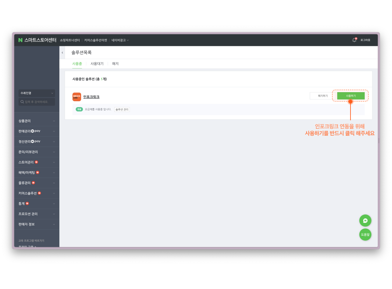 #### (2) [인포크링크 솔루션](https://solution.smartstore.naver.com/ko/solution/SOL_1nthqHycfVX4HfbJMfRznt/detail) 사용하기