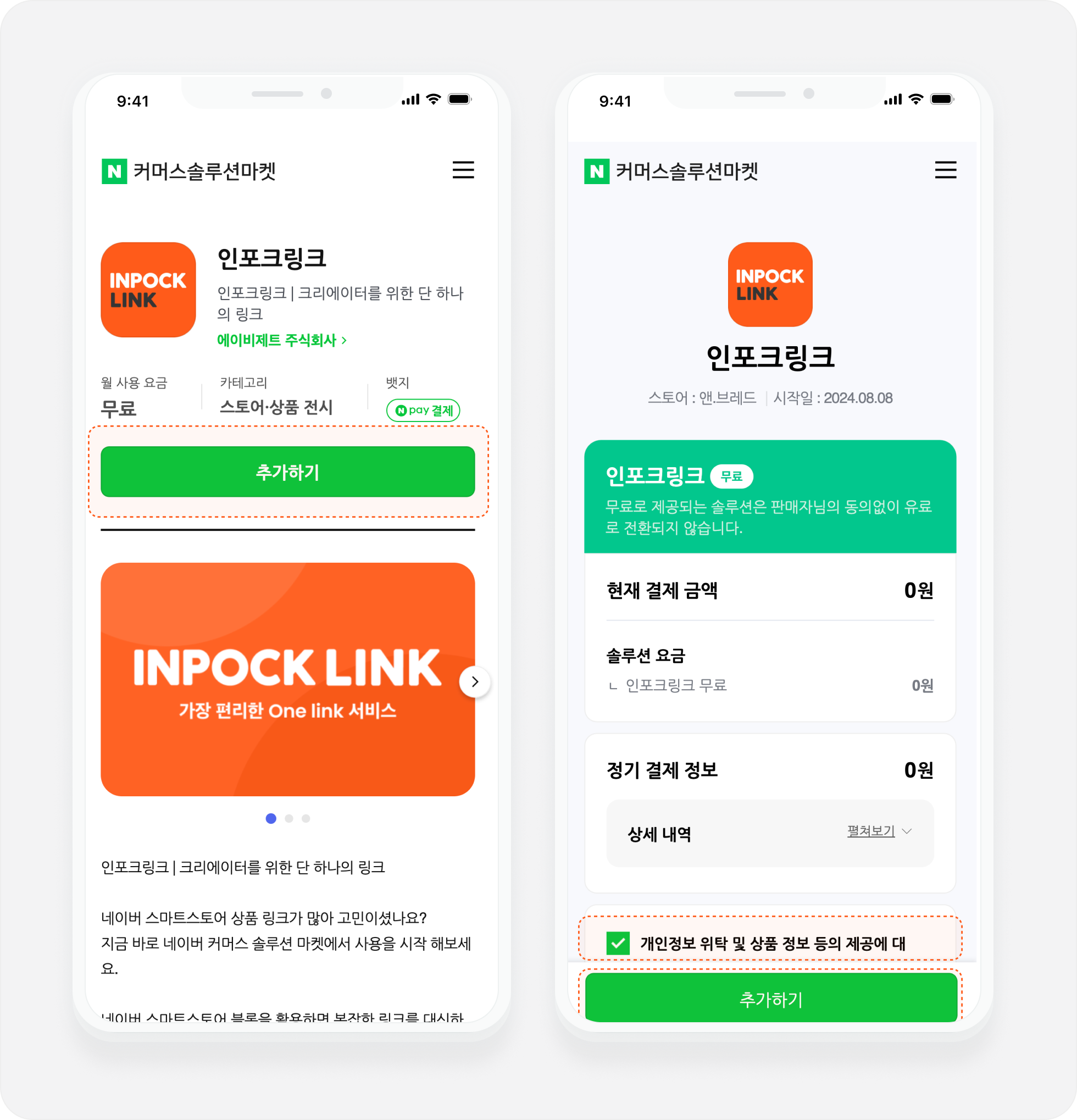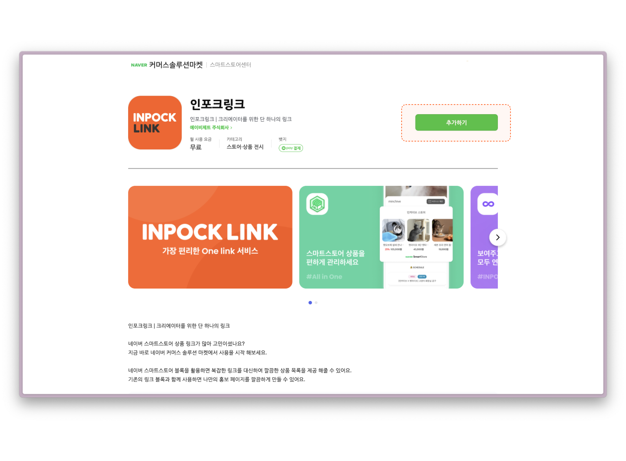 [네이버 커머스 솔루션 마켓](https://solution.smartstore.naver.com/ko/home)의 인포크링크 페이지에서 **'추가하기'** 버튼을 눌러주세요.