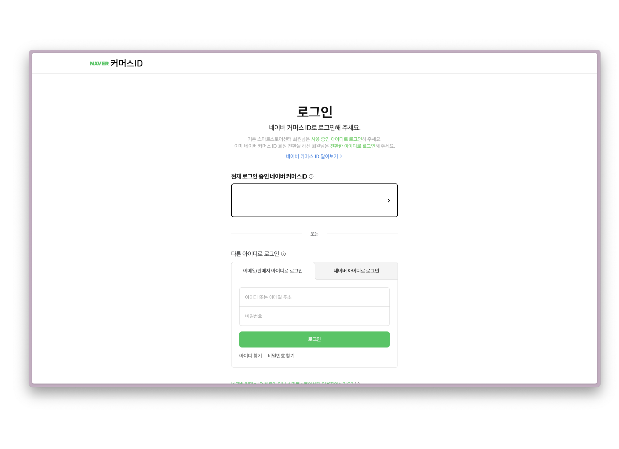 **반드시&#x20;**<mark style="color:green;">**네이버 커머스 ID**</mark>**&#x20;로그인이 필요합니다.**\